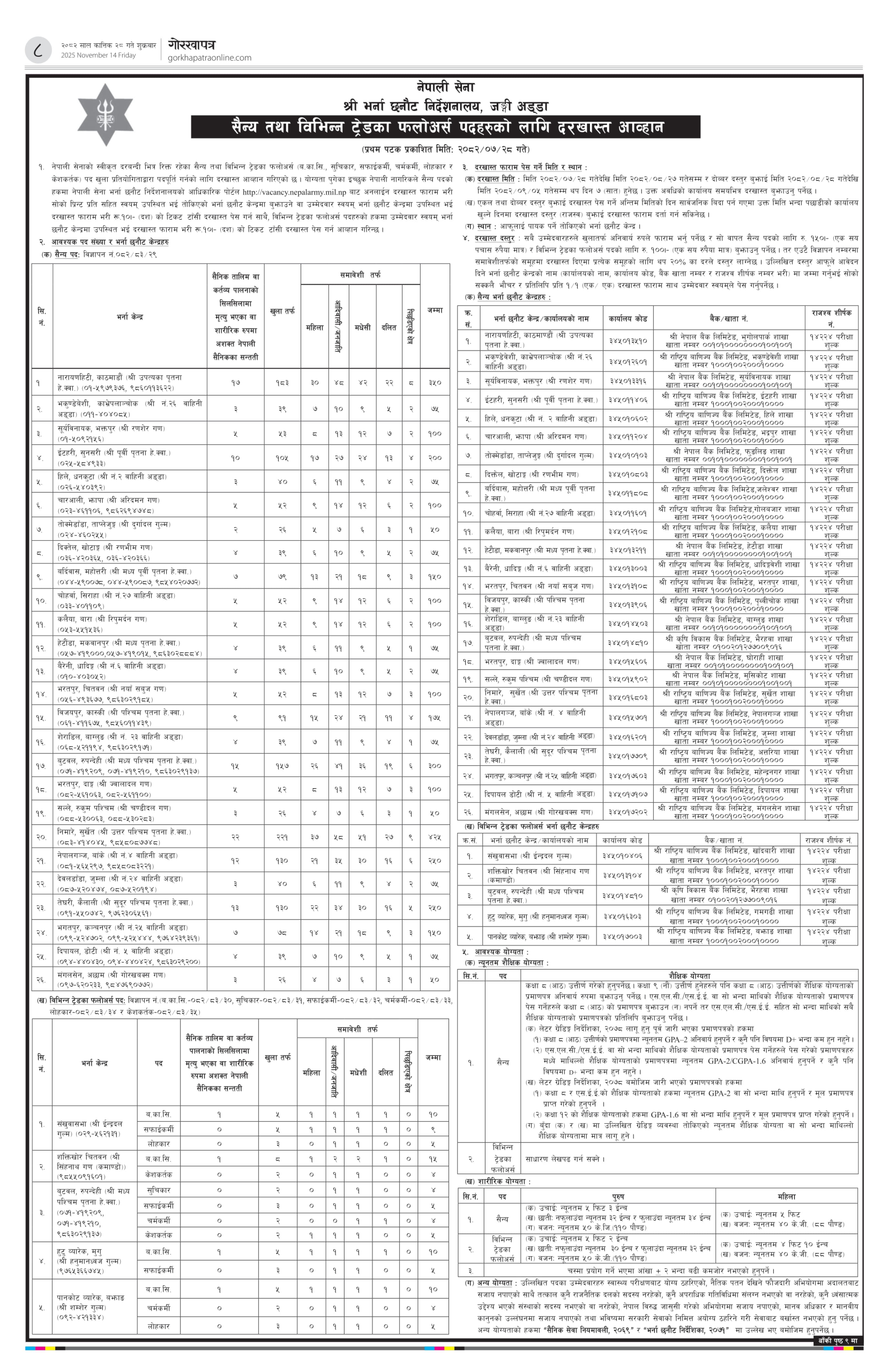उपत्यका पृतना नारायणहिटीका लागि ३५० जना, काभ्रेको भकुण्डेबेसीस्थित २६ नम्बर बाहिनी अड्डाका लागि ७५ जना, भक्तपुरको सूर्यविनायकस्थित रणशेर गणका लागि एक सय जना, सुनसरीको इटहरीस्थित पूर्वी पृतना हेडक्वार्टरका लागि दुई जनालगायत विभिन्न गणमा विभिन्न सङ्ख्यामा सैन्य पदमा नयाँ भर्ना लिन लागेको हो ।